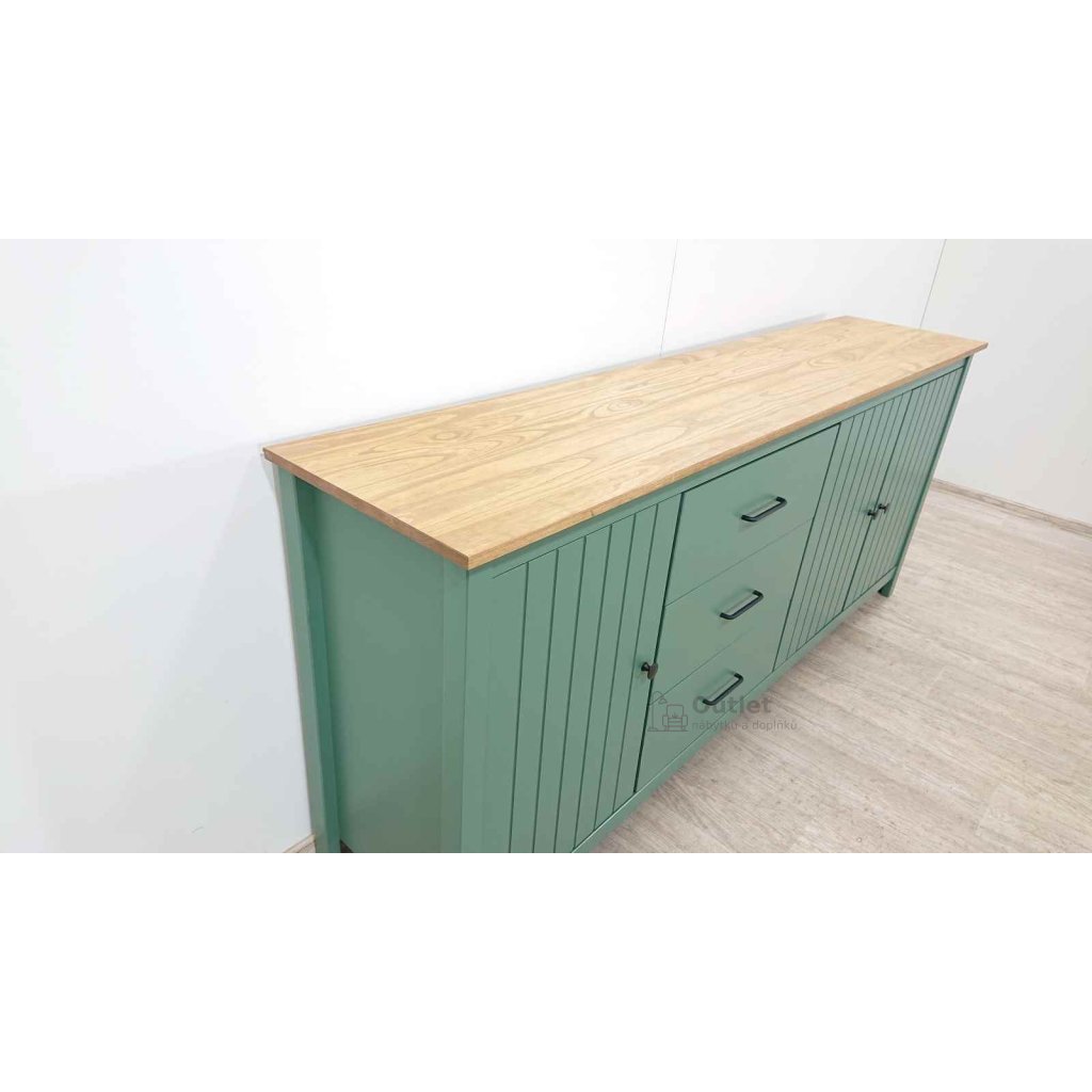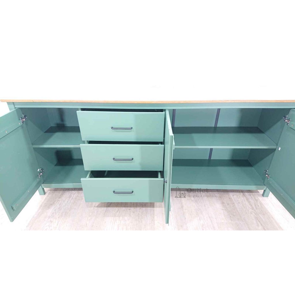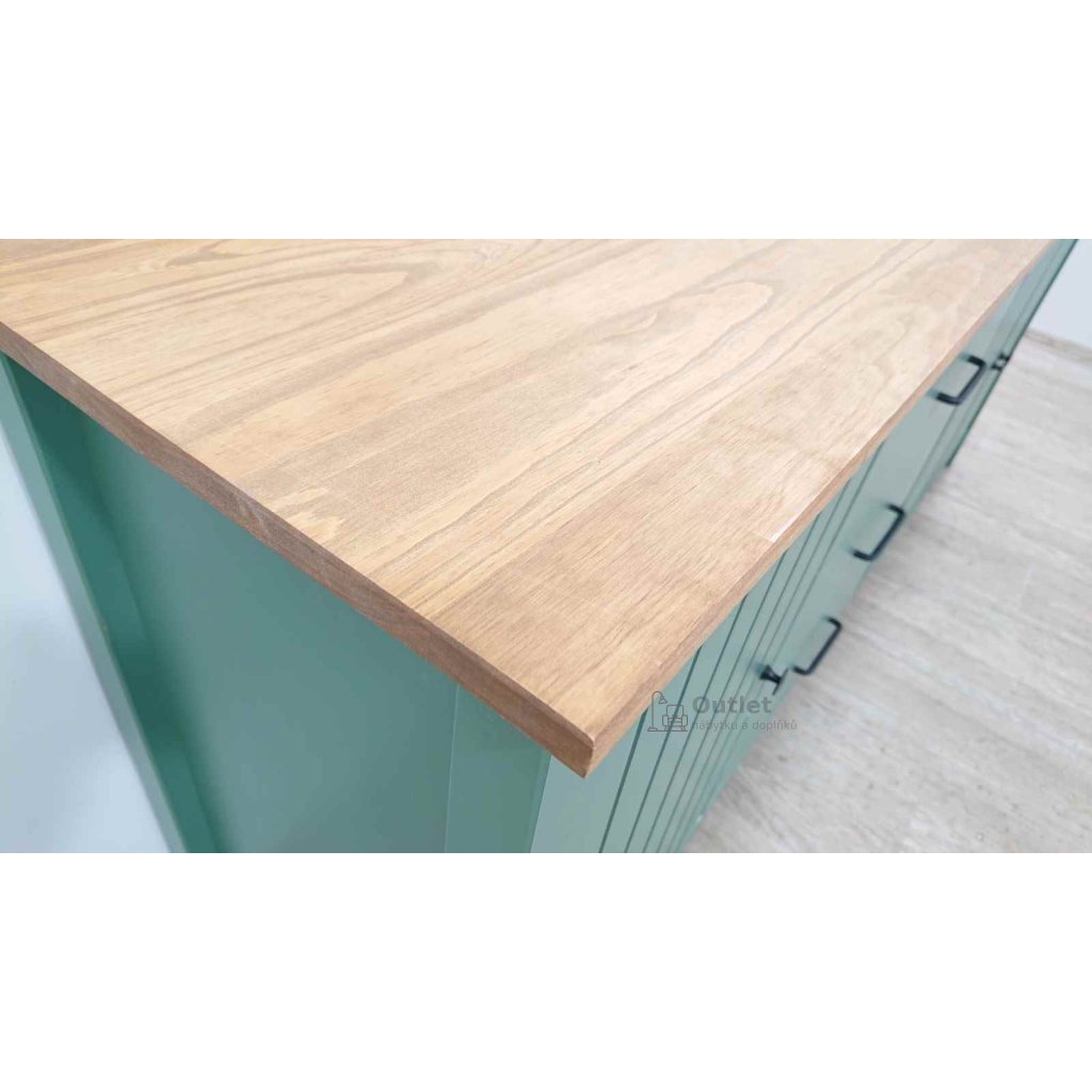Velká masivní komoda s šuplíky a policemi, vhodná na oblečení i doplňky. Umístit ji můžete do ložnice, obýváku i do dětského pokoje. Příjemná zelená barva doplněná o přírodní desku působí příjemným, uklidňujícím dojmem. Tato široká skříňka s kovovými úchytkami ladí s moderním, skandinávským i venkovským stylem bydlení.