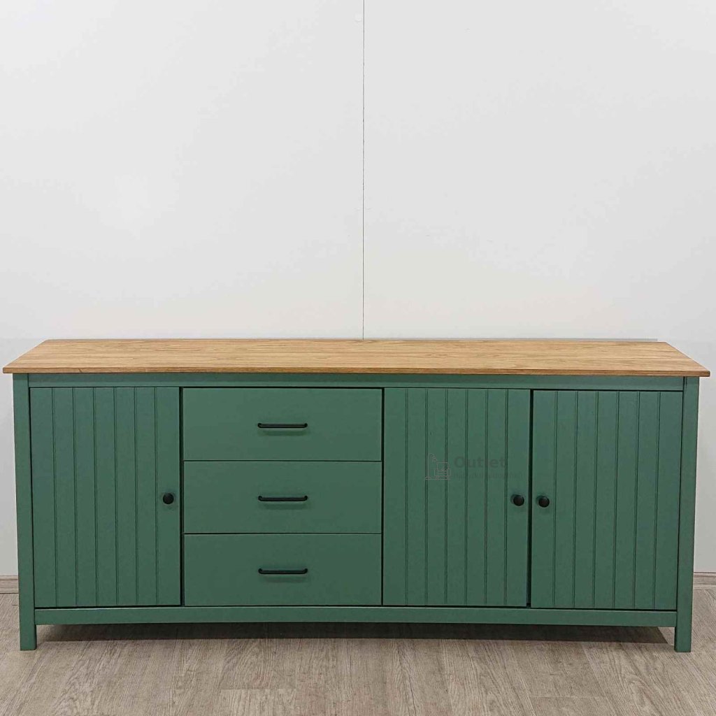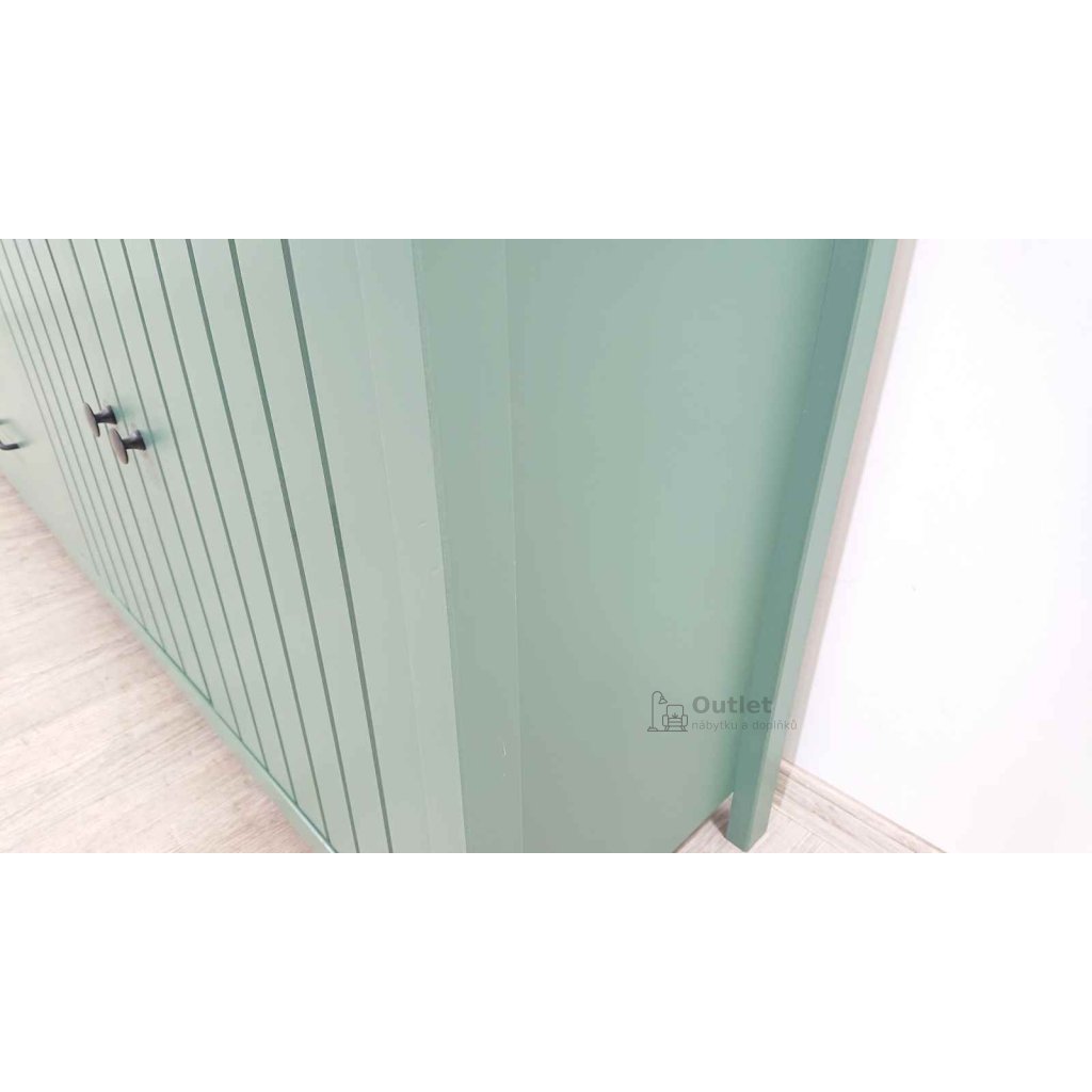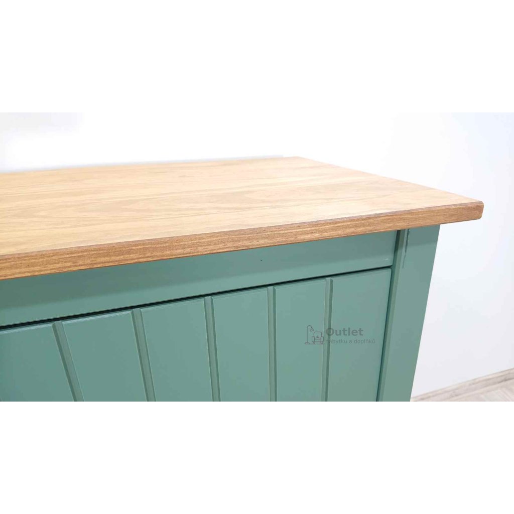Velká masivní komoda s šuplíky a policemi, vhodná na oblečení i doplňky. Umístit ji můžete do ložnice, obýváku i do dětského pokoje. Příjemná zelená barva doplněná o přírodní desku působí příjemným, uklidňujícím dojmem. Tato široká skříňka s kovovými úchytkami ladí s moderním, skandinávským i venkovským stylem bydlení.