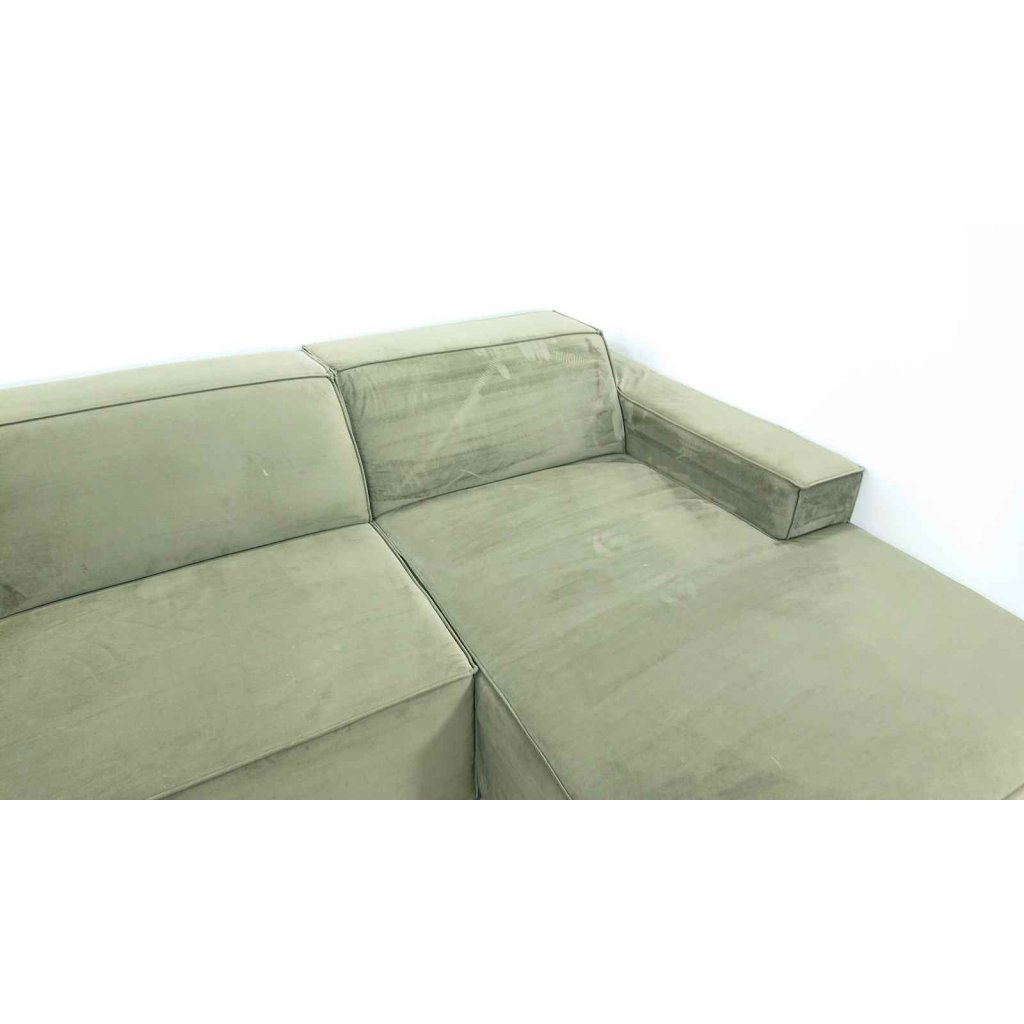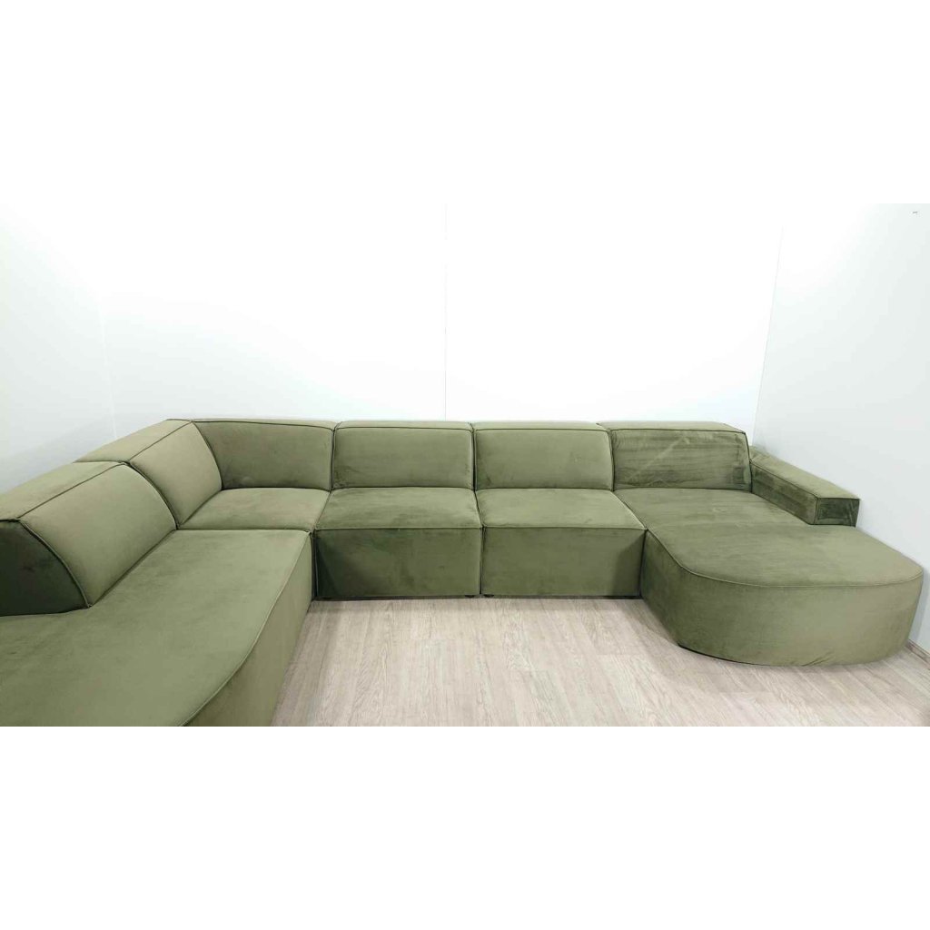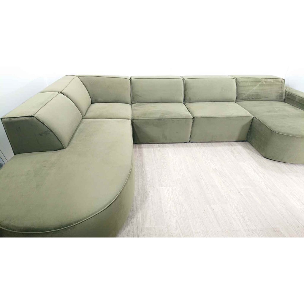 Obrovská pohovka, která si zaslouží hodně místa. Má sametově hebký potah v módní zelené barvě.