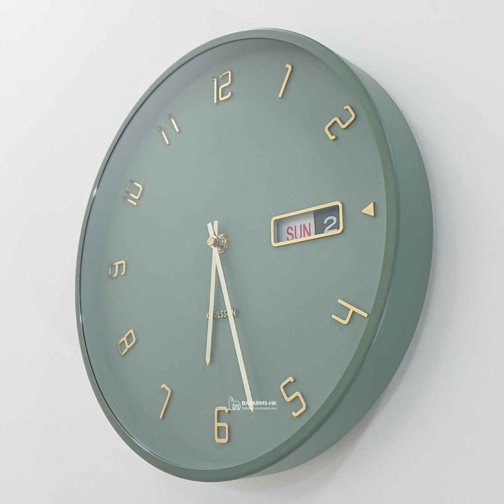 Designové hodiny v pastelové zelené barvě se zlatými detaily.