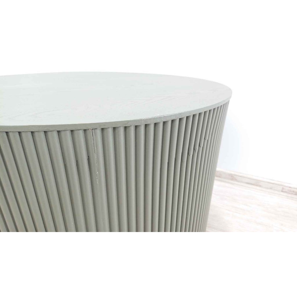 Kulatý stoleček v příjemném decentním odstínu umístěte před pohovku nebo vedle křesílka. Na desce je vidět krásná struktura dřeva a korpus je vroubkovaný.